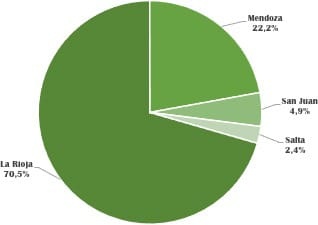 Mendoza tiene la mayor cantidad de hectáreas, alcanzando en 2024 las 3.482 ha (39,4%), seguida por San Juan con 2.225 ha (25,2%), La Rioja con 1.786 ha (20,2%) y el resto de las provincias con 1.351 ha (15,3%).