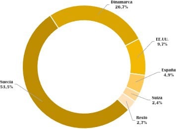 Los principales destinos de exportación este año son: Suecia (53,4%), Dinamarca (26,7%), EE.UU. (9,7%) y España (4,9%).