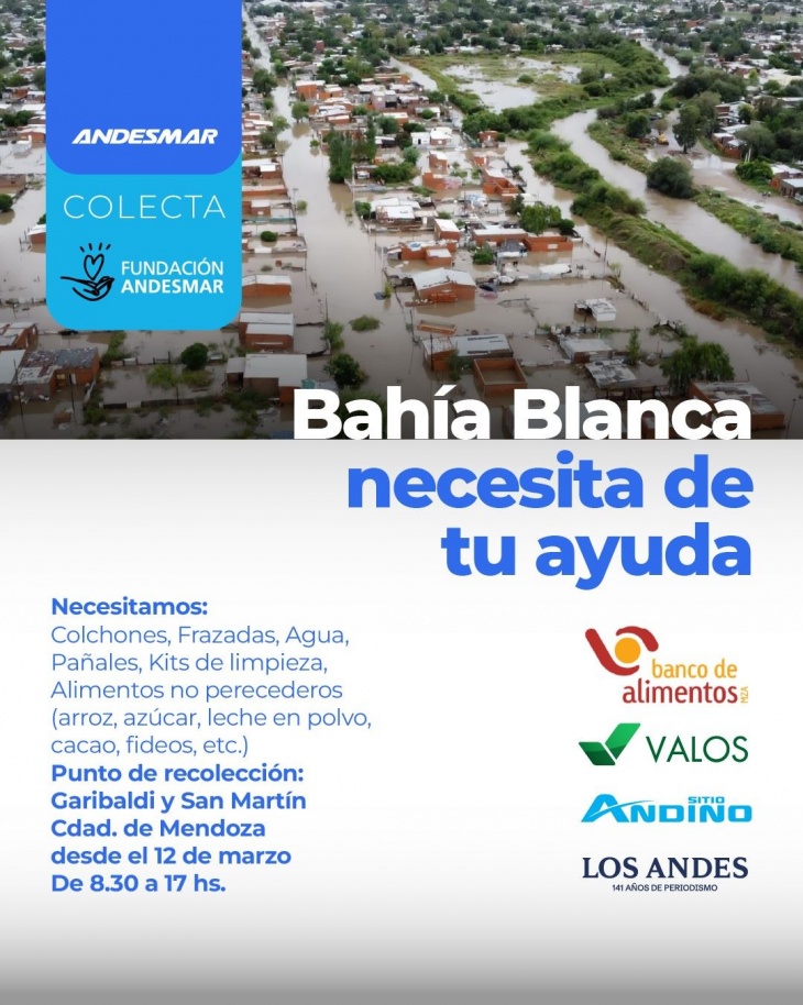 Fundación Andesmar junto a Valos y al Banco de Alimentos llevan adelante una campaña solidaria para la ciudad de Bahía Blanca que fue azotada por un intenso temporal en las primeras horas del viernes pasado. La fuerte tormenta dejó 300 milímetros de agua acumulada, además de 16 víctimas, viviendas, calles colapsadas y más de 1.400 evacuados.