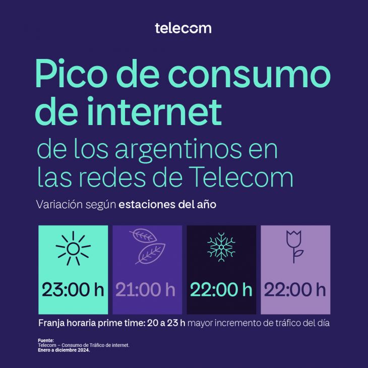 El análisis del comportamiento de los usuarios durante 2024 muestra que las horas pico de tráfico en la red se concentraron entre las 21:00 y las 23:00 horas. Este patrón responde a la demanda nocturna de entretenimiento y comunicación, en un contexto donde la conectividad ya forma parte central del ocio cotidiano de los argentinos.