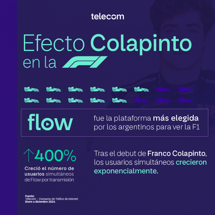Uno de los fenómenos del año fue el llamado "Efecto Colapinto". El debut del piloto argentino Franco Colapinto en la Fórmula 1 disparó la audiencia en Flow, la plataforma de contenidos de Telecom, que registró un récord histórico de usuarios simultáneos durante las transmisiones de las carreras.