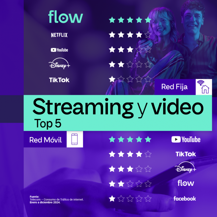 El streaming de video mantuvo su liderazgo durante 2024. En redes fijas, Flow se posicionó como la plataforma más utilizada, destacándose por su propuesta que incluye TV en vivo, contenidos originales, estrenos de cine, deportes y recitales.