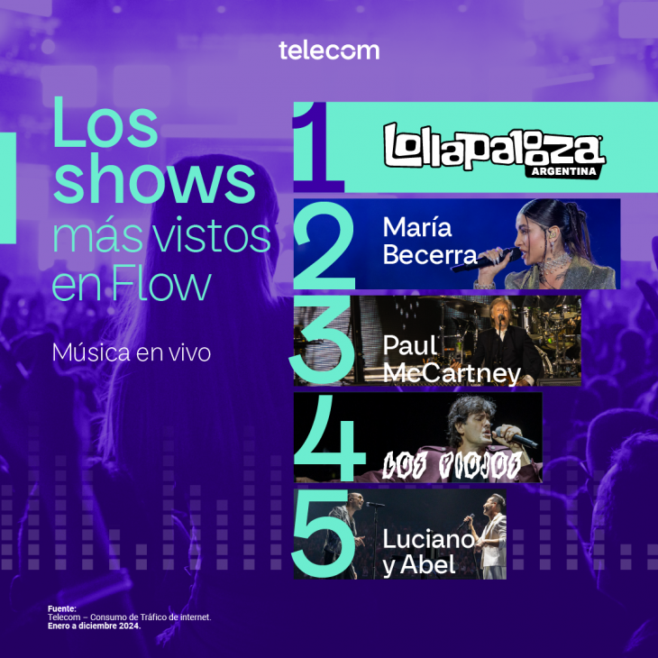 El consumo de música en vivo también mostró un crecimiento sostenido. Flow se consolidó como una plataforma clave para la transmisión de recitales y festivales exclusivos, entre ellos el Lollapalooza Argentina, uno de los más vistos del año.