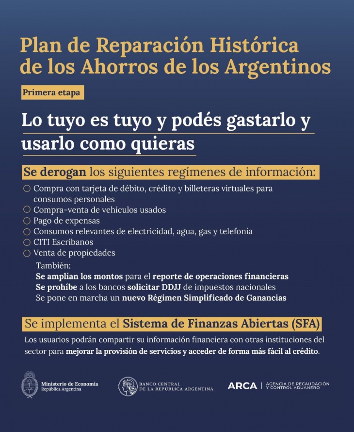 El anuncio fue realizado por el vocero presidencial Manuel Adorni, el ministro de Economía Luis Caputo, el titular de ARCA Juan Pazo, y el presidente del Banco Central, Santiago Bausili. Según explicaron, esta política busca canalizar parte de los más de US$ 200.000 millones que se encuentran fuera del sistema financiero.