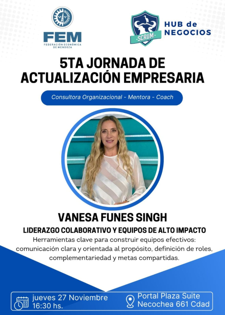 La Federación Económica de Mendoza (FEM) y SCRUM Hub de Negocios realizarán la 5ta y última Jornada de Actualización Empresaria del año, un encuentro que marcará el cierre del ciclo 2025 de formación para dirigentes y gestores empresariales. La actividad se llevará a cabo el jueves 27 de noviembre a las 16:30, en Portal Plaza Suite (Necochea 661, Ciudad de Mendoza).