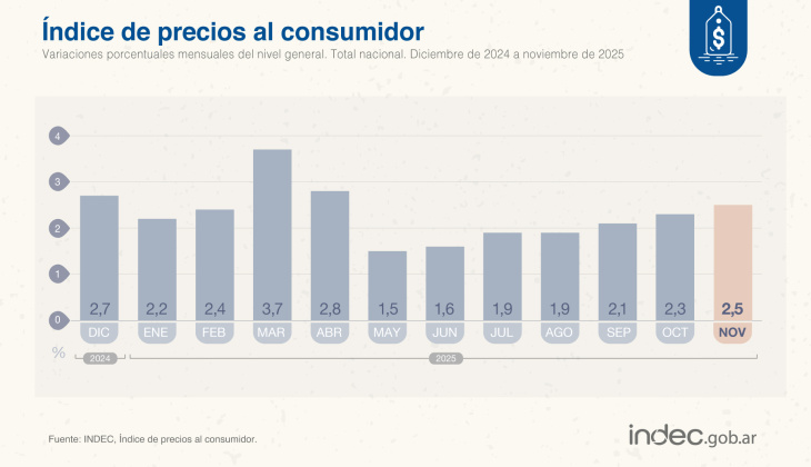 La dinámica de precios volvió a tensionar el cuadro macroeconómico argentino en noviembre, pese al ajuste fiscal, la apertura importadora y el estancamiento salarial que el Gobierno identifica como anclas antiinflacionarias. Lejos de desacelerarse, el Índice de Precios al Consumidor (IPC) avanzó 2,5 por ciento, alcanzando su nivel más alto desde abril y consolidando una tendencia que no cede desde mayo. La combinación entre tarifazos, aumentos en el transporte, el salto en alimentos y la presión de los costos en un mercado deprimido produjo un escenario poco compatible con la promesa oficial de una normalización rápida.