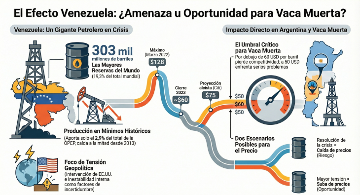 Gerardo Rabinovich, vicepresidente del Instituto Argentino de la Energía General Mosconi, coincide en que podría haber un rebote de corto plazo, pero advierte que en el mediano plazo Venezuela podría sumar producción a la sobreoferta existente. “Esto no es bueno para Vaca Muerta, porque por debajo de 60 dólares por barril empieza a perder competitividad, y en valores de 50 dólares tiene serios problemas para salir al mercado internacional”, señala.