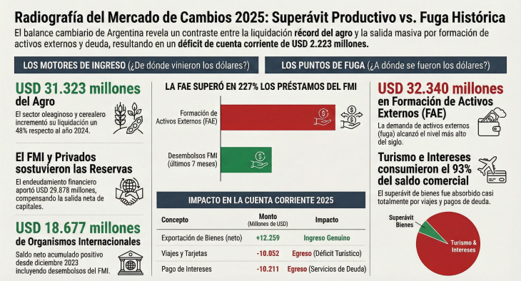 Más allá del turismo, el fenómeno más determinante del año fue la magnitud de la Formación de Activos Externos (FAE), es decir, la dolarización de portafolios del sector privado. En 2025, la FAE alcanzó los 32.340 millones de dólares, el registro más alto del siglo XXI.