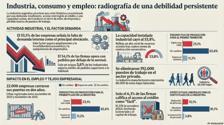 Cuando se consulta por los factores que limitan la producción, la respuesta es contundente: la demanda interna insuficiente aparece como el principal freno para más del 53% de las empresas. La competencia de productos importados, la incertidumbre macroeconómica y la escasez de insumos quedan muy por detrás.