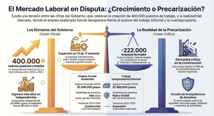 Ante este señalamiento, el ministro opuso otro argumento: los ingresos. Según su análisis, el trabajador independiente promedio percibió en 2025 unos 1.460.000 pesos mensuales, superando los 1.300.000 del asalariado formal en el mismo período. Si la retribución es mayor, razona el funcionario, ¿cabe hablar de deterioro? La respuesta no es sencilla. Los ingresos del trabajo independiente son, por naturaleza, volátiles; no incluyen aguinaldo, no cuentan con cobertura en caso de accidente laboral y dependen de la continuidad de la demanda. Comparar promedios es, en este contexto, un ejercicio que ilumina tan poco como oculta.