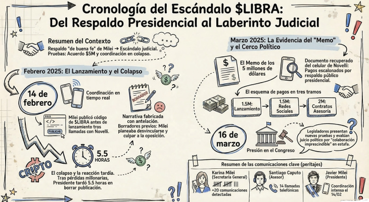 El fin de semana dejó una marca difícil de borrar en el gobierno de Javier Milei. La causa judicial por el escándalo de la criptomoneda $LIBRA —que en febrero de 2025 dejó a miles de inversores con pérdidas millonarias tras un colapso fulminante de su cotización— acumuló en apenas 48 horas un volumen de evidencia que el oficialismo no ha logrado rebatir con argumentos sólidos. Lo que comenzó como una polémica por el respaldo presidencial a un activo digital de dudosa procedencia se consolida, semana a semana, como el mayor desafío institucional de la gestión libertaria.