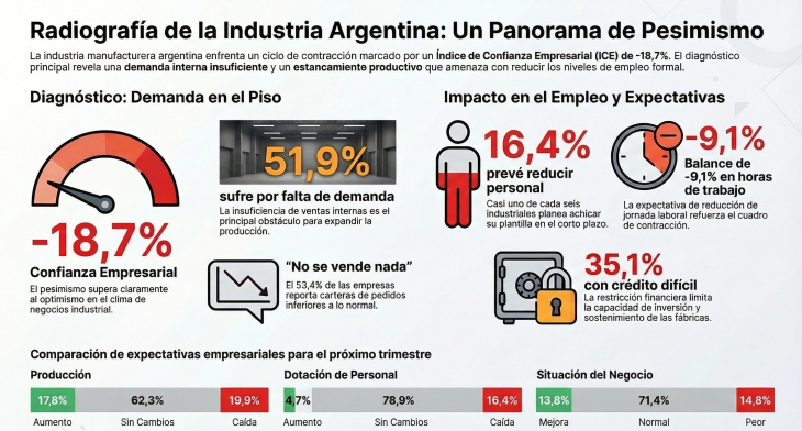La industria manufacturera argentina transita un período de marcada fragilidad. El Indicador de Confianza Empresarial (ICE) del sector, elaborado mensualmente por el Instituto Nacional de Estadística y Censos (INDEC) a partir de la Encuesta de Tendencia de Negocios, se ubicó en febrero de 2026 en -18,7%, un nivel que, si bien representa una recuperación parcial respecto del mínimo registrado en el segundo semestre de 2025, continúa en terreno negativo y no logra acercarse a los valores de comienzos del año anterior. El indicador puede oscilar entre -100% y 100%, de modo que un registro próximo a -19 puntos porcentuales refleja un clima empresarial donde el pesimismo supera con claridad al optimismo.