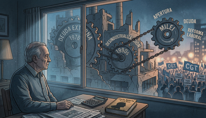 Esa dimensión fue señalada con precisión por Rodolfo Walsh en su Carta Abierta a la Junta Militar. Junto a la denuncia de las desapariciones, Walsh describió el programa económico que las hacía posibles. El plan implementado por José Alfredo Martínez de Hoz —miembro de la familia fundadora de la Sociedad Rural y presidente de ACINDAR en 1975— inauguró una matriz que marcaría las décadas siguientes: endeudamiento externo acelerado, apertura comercial, desarticulación del aparato productivo, concentración del ingreso y predominio de la valorización financiera sobre la producción.